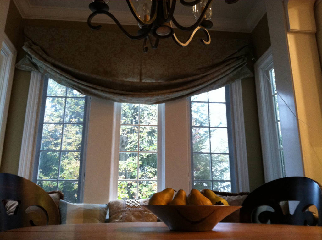 A client contacted me to dress her kitchen table window with a relaxed Roman shade. This large custom covering measures 90" x 69" and is lined with white fabric to match the exterior window trim. |  |