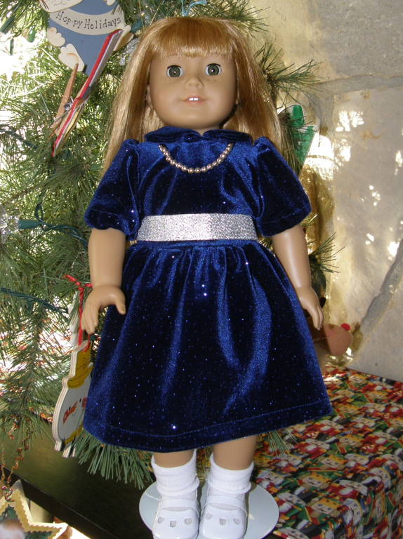 A mom wanted a blue "velvet" dress for her daughter's 18" doll. She let me know what color and completion time. Sunnybrook Studio thinks this doll will be the shiniest 18" at the New Year's Eve ball! |  |
