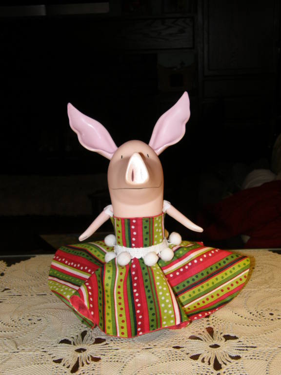 A mom bought a Christmas skirt from the Nutcrakcer Collection, but her daughter likes Olivia the pig. Since the 18" skirt wouldn't fit Olivia, I designed an evening gown that would! All I needed was Olivia and her red dress for a few hours. Olivia is very excited to celebrate this year! We at Sunnybrook Studio think she looks smashing! |  |